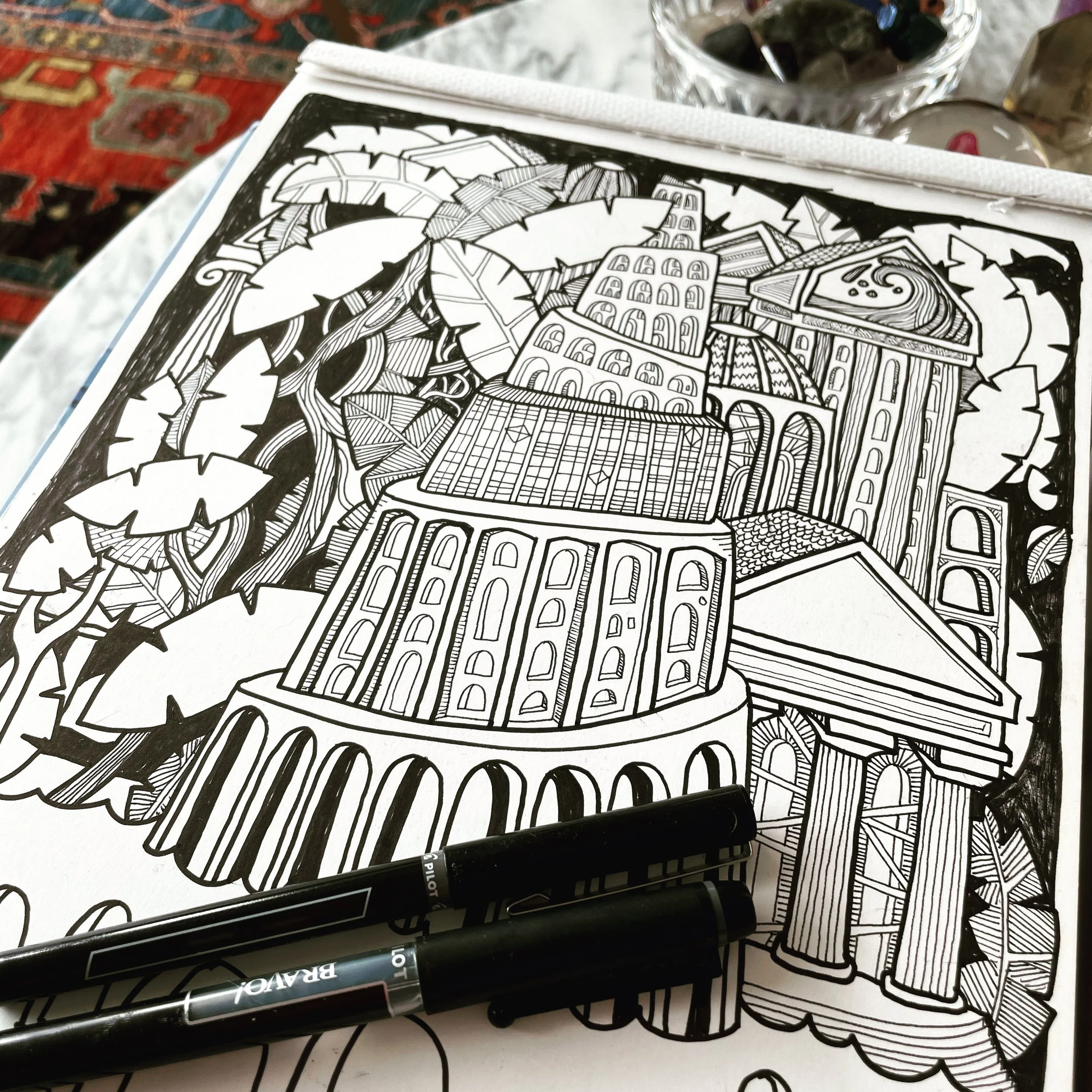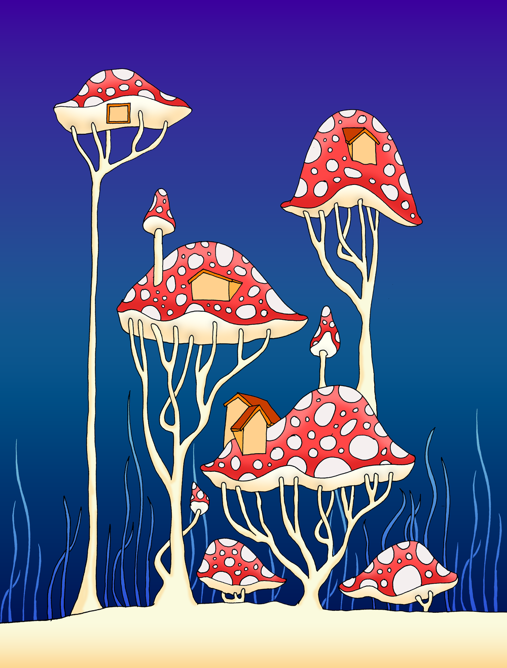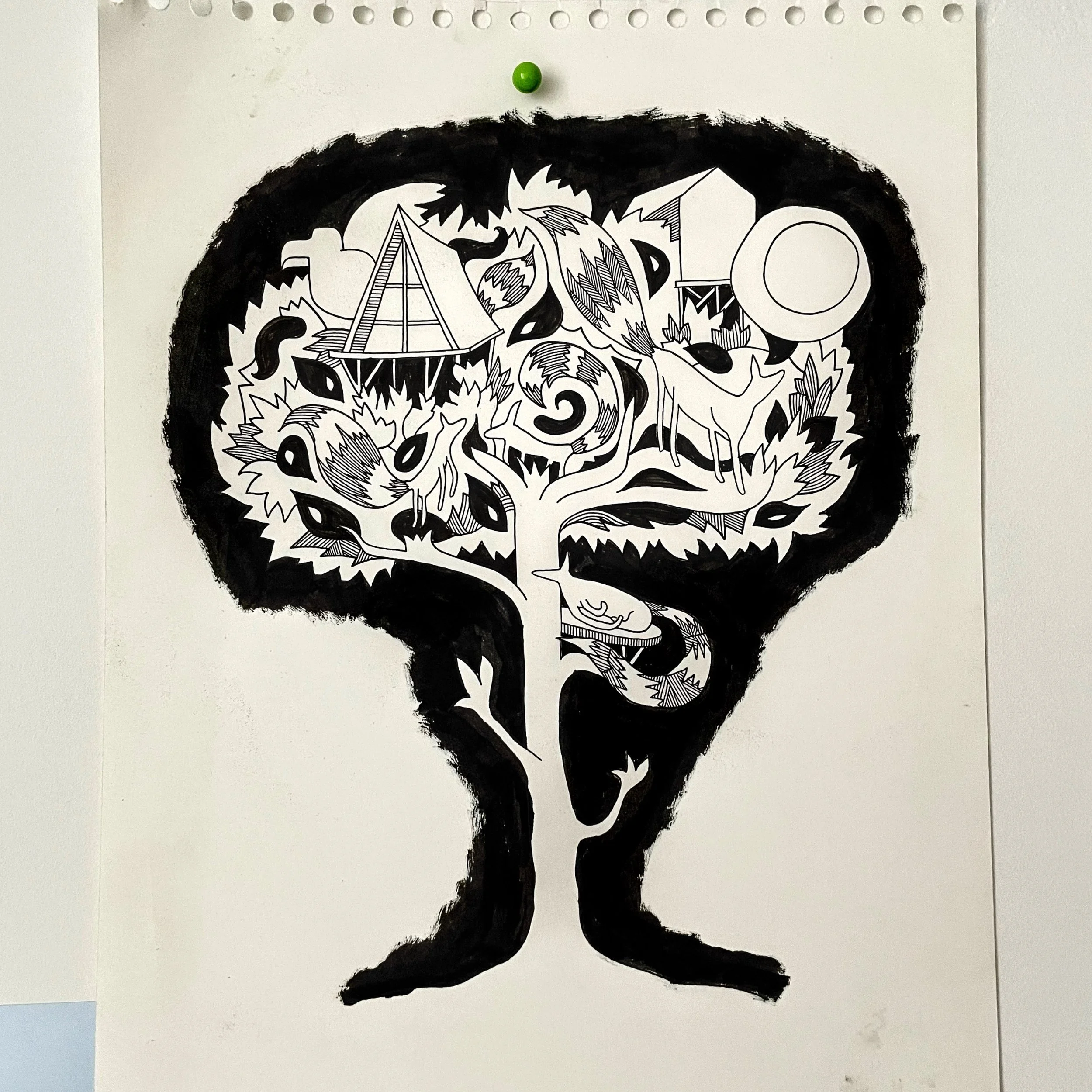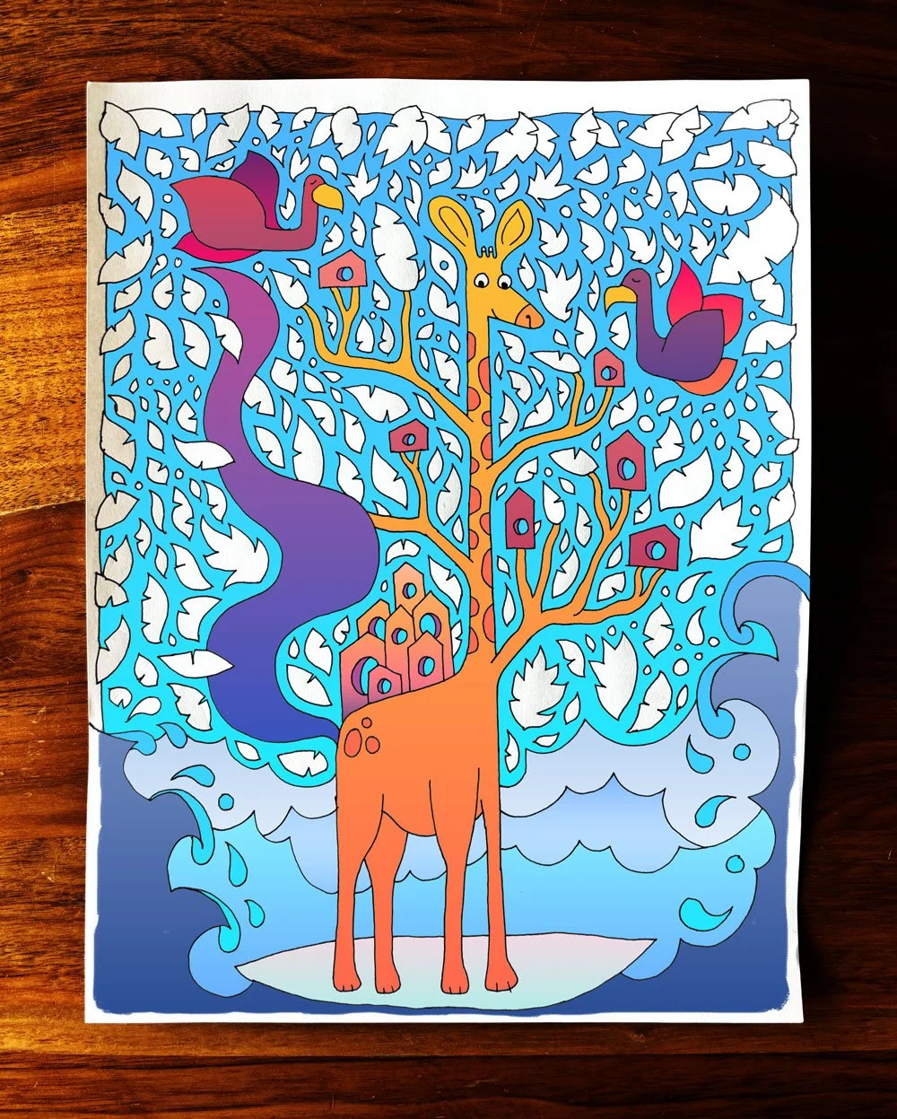 Starting with hand-drawn ink sketches, my work imagines a joyful future filled with impossible architecture, musical forests, animals voyaging to space and traversing the seas. These images remind us of our deeper connection with our fellow creatures in this and future worlds.